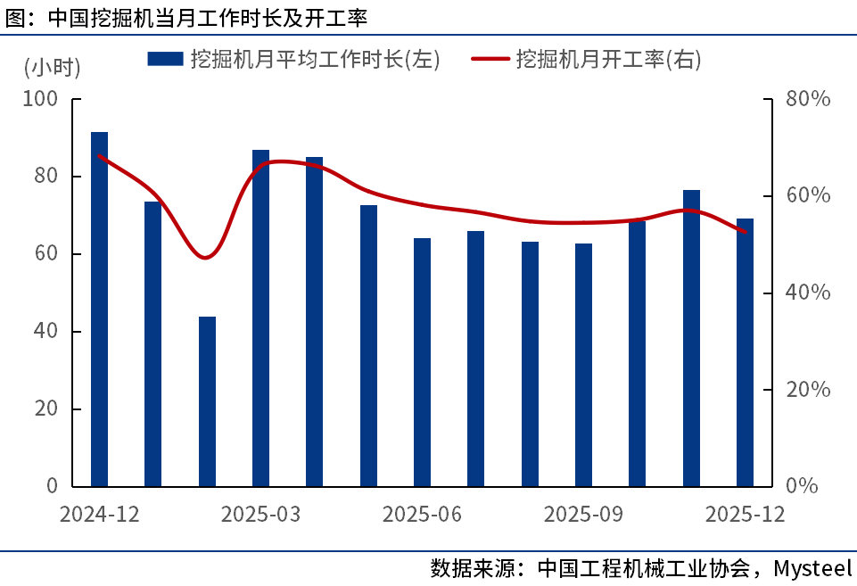 12月,我國工程機械主要產(chǎn)品月平均工作時長為76.5小時,同比下降18.6%,環(huán)比下降9.19%。其中:挖掘機69.3小時。