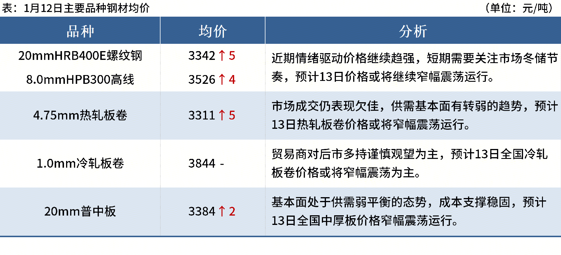 ◎1月12日,全國主港鐵礦石成交75.24萬噸,環(huán)比減19.7%;237家主流貿(mào)易商建筑鋼材成交10.58萬噸,環(huán)比增18.5%。