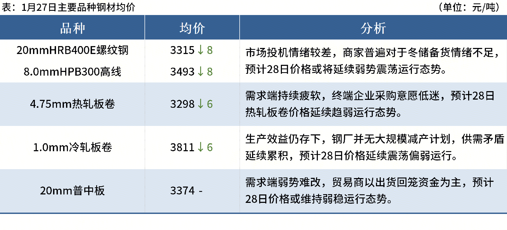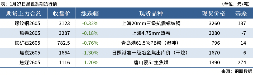 ◎1月27日,全國(guó)主港鐵礦石成交80.95萬(wàn)噸,環(huán)比減23.2%;237家主流貿(mào)易商建筑鋼材成交6.63萬(wàn)噸,環(huán)比減12.8%。