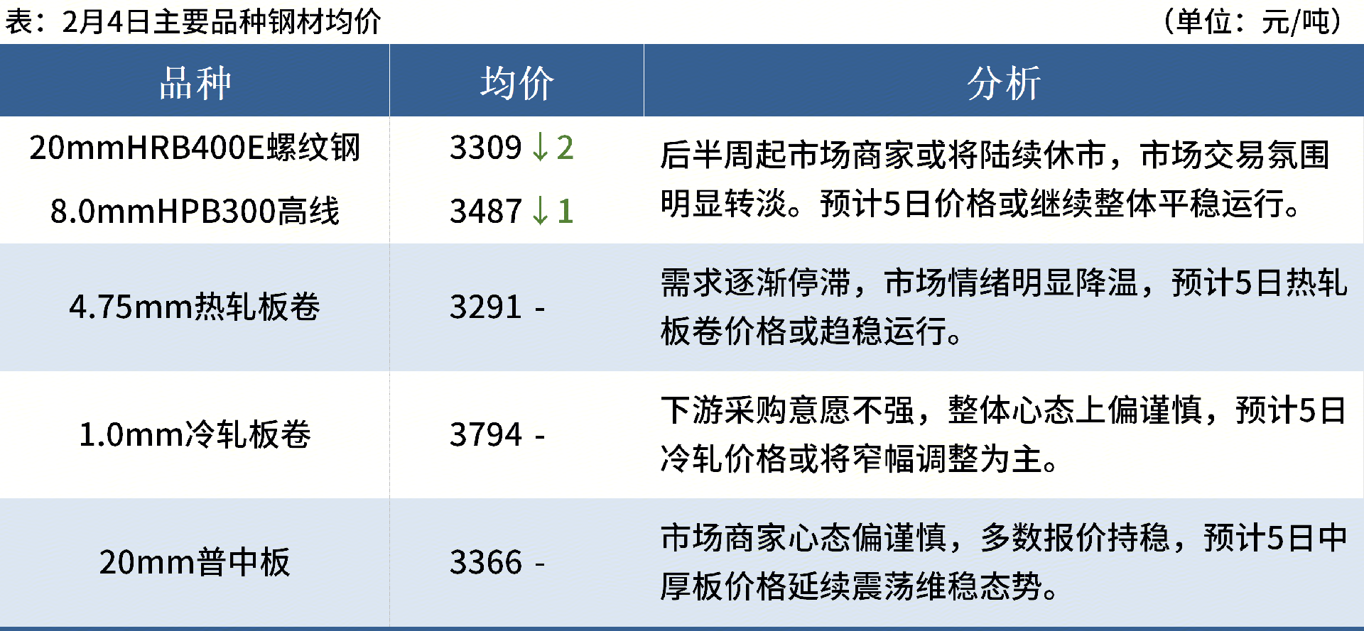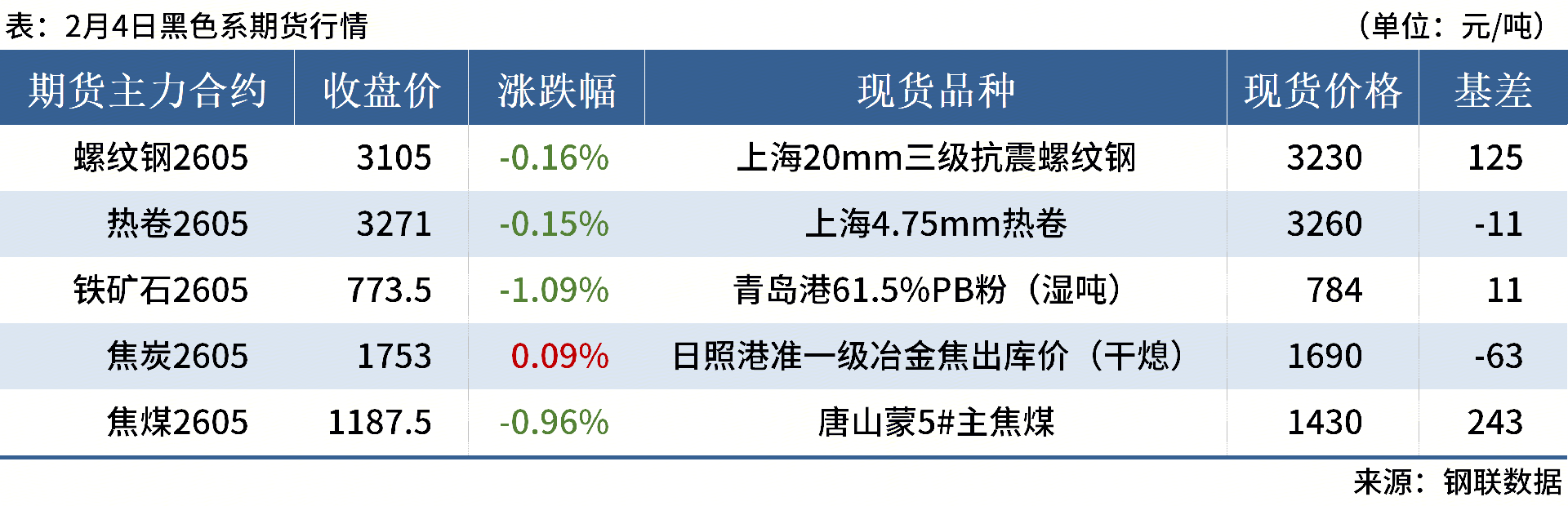 ◎ 2月4日,全國主港鐵礦石成交103.40萬噸,環(huán)比增14%;237家主流貿(mào)易商建筑鋼材成交3.61萬噸,環(huán)比減12.6%。