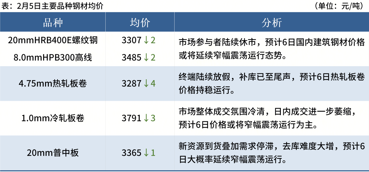 ◎ 2月5日,全國主港鐵礦石成交98.60萬噸,環(huán)比減4.6%;237家主流貿(mào)易商建筑鋼材成交2.79萬噸,環(huán)比減22.7%。